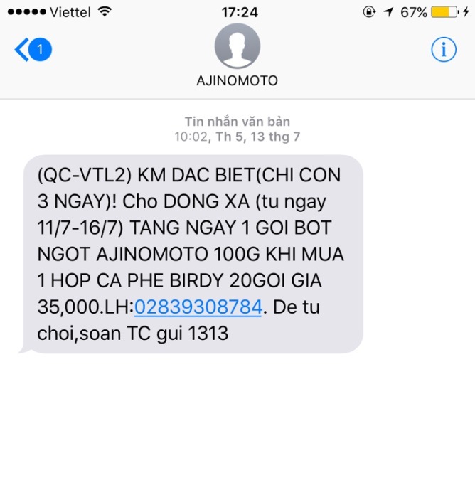 Tin nhắn Quảng cáo Khuyến mãi cho khách hàng thân thiết của Ajinomoto