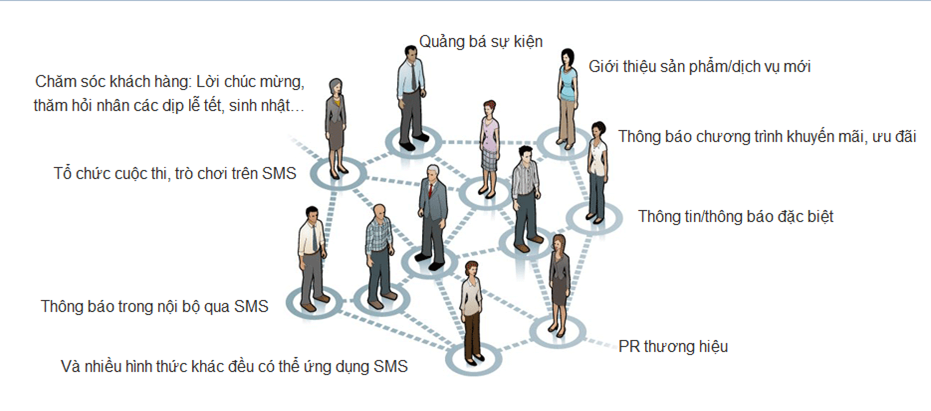 Doanh nghiệp gửi thông báo đến các hệ thống đại lý của mình Các doanh nghiệp kinh doanh Ðiện lực, Ðiện thoại, Internet, Nước… có thể gửi thông báo cước, nhắn nợ cước cho khách hàng…